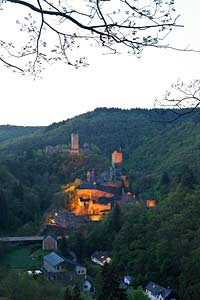 Manderscheid, Landkreis Bernkastel-Wittlich, Eifel, Blick auf Ruine Oberburg, Ruine Niederburg und Landschaft