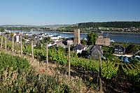 Rüdesheim, Ruedesheim am Rhein, Rheingau-Taunus-Kreis, Mittelrhein, Blick über, ueber Weinreben auf Broemser, Brömser Burg, Rhein und Ort
