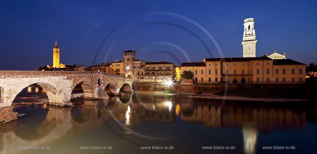 Verona, Panoramablick auf Ponte Pietra mit Etsch San Anastasia und Dom in Abendstimmung